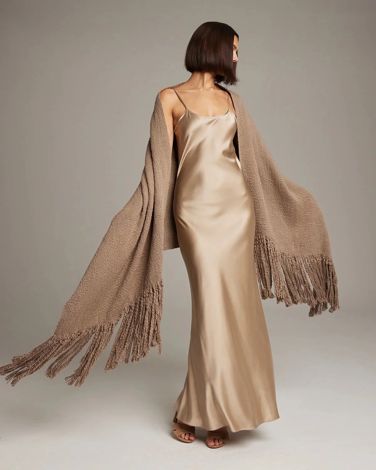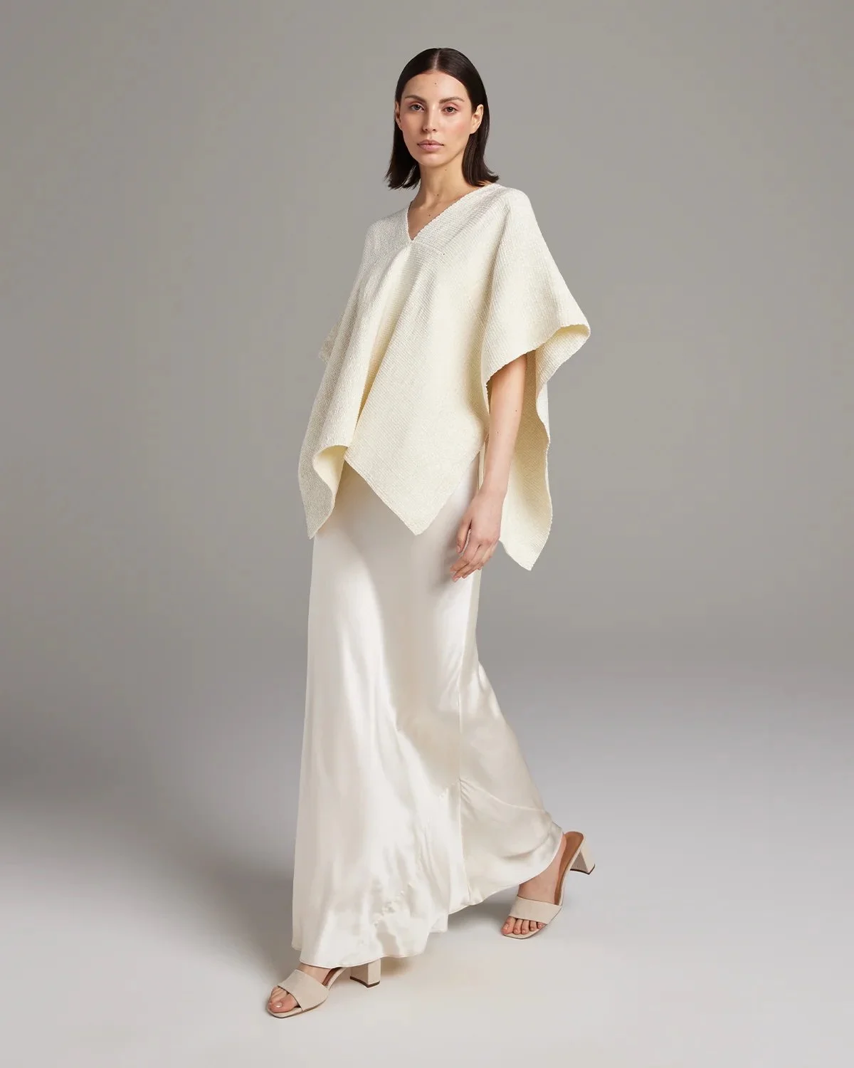 The collection consists of fluid silk slip dresses and coordinates paired with textured hand knitted sweaters from Peru and luxurious hand loomed ponchos and wraps from Chile, many featuring traditional woven borders and patterns.